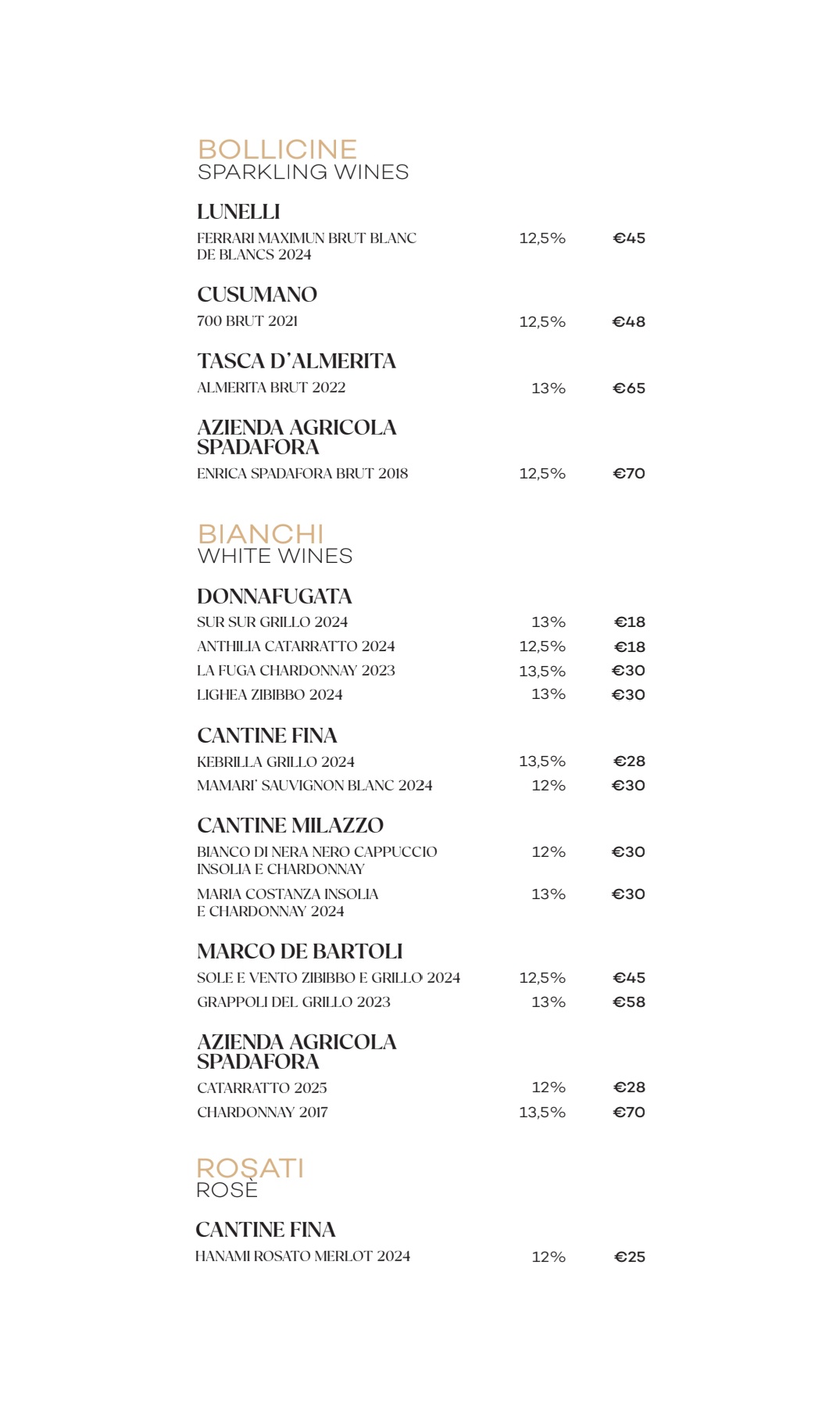 Vini siciliani selezionati e una ricca carta di bevande
