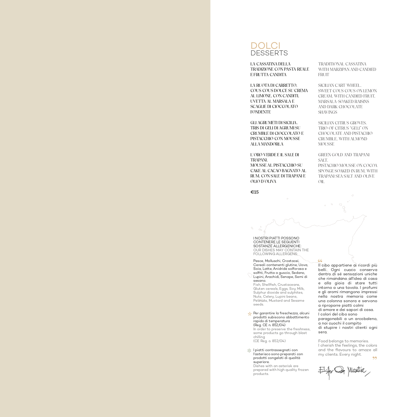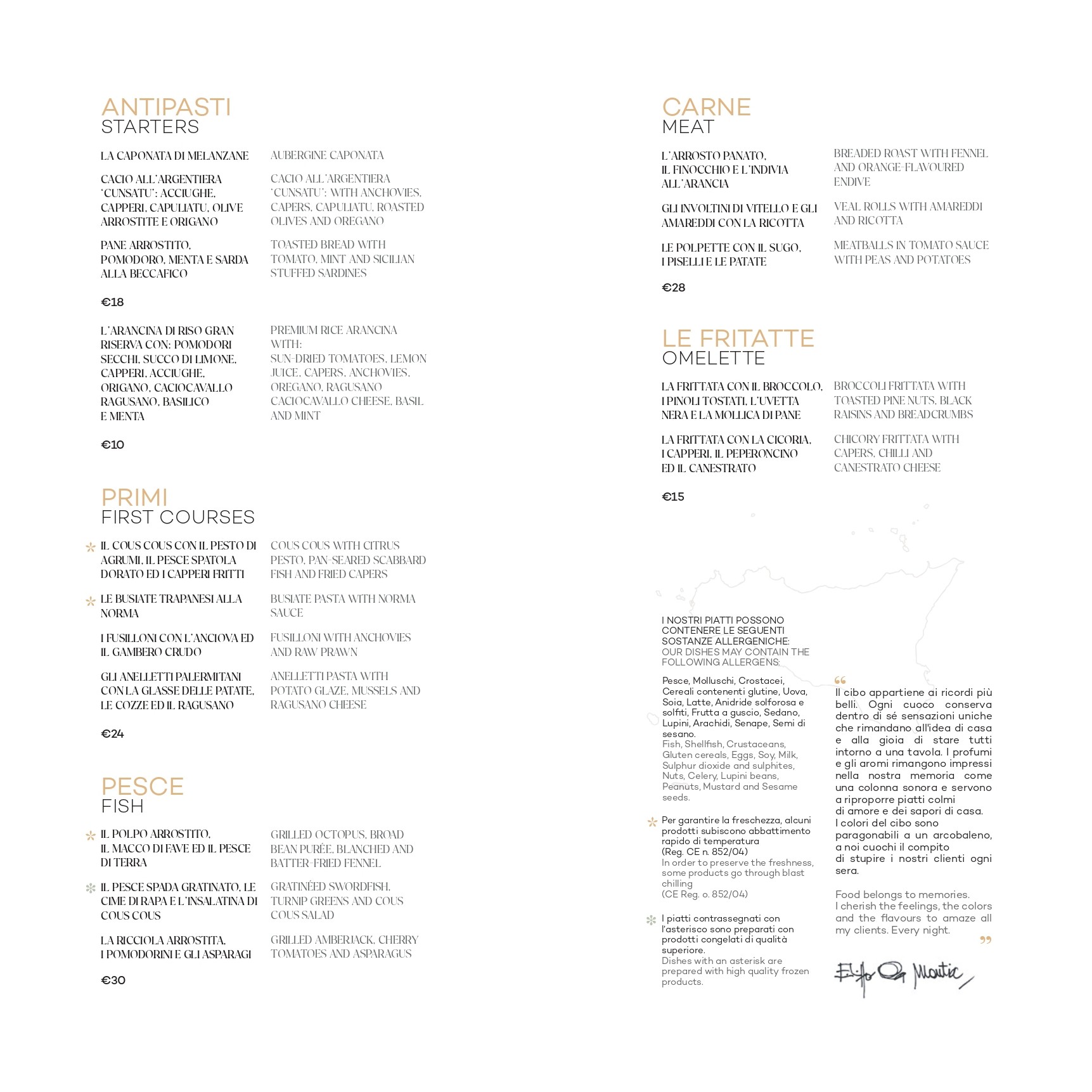 Menu à la carte con piatti tipici siciliani,
